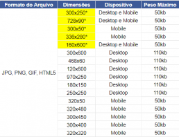 As peças precisam ser confeccionadas em uma das medidas-padrão a seguir. Os formatos destacados com ” * ” são os que possuem maior disponibilidade de entrega. Sugerimos incluir os formatos destacados com ” * ” em todas as campanhas.